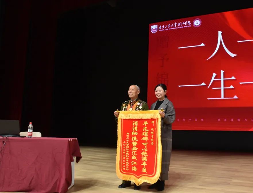 在趙明才前輩與同學(xué)們分享了他與雷鋒同志的故事后,機(jī)電學(xué)院黨支部書記肖俊英老師為趙明才前輩贈送了錦旗。